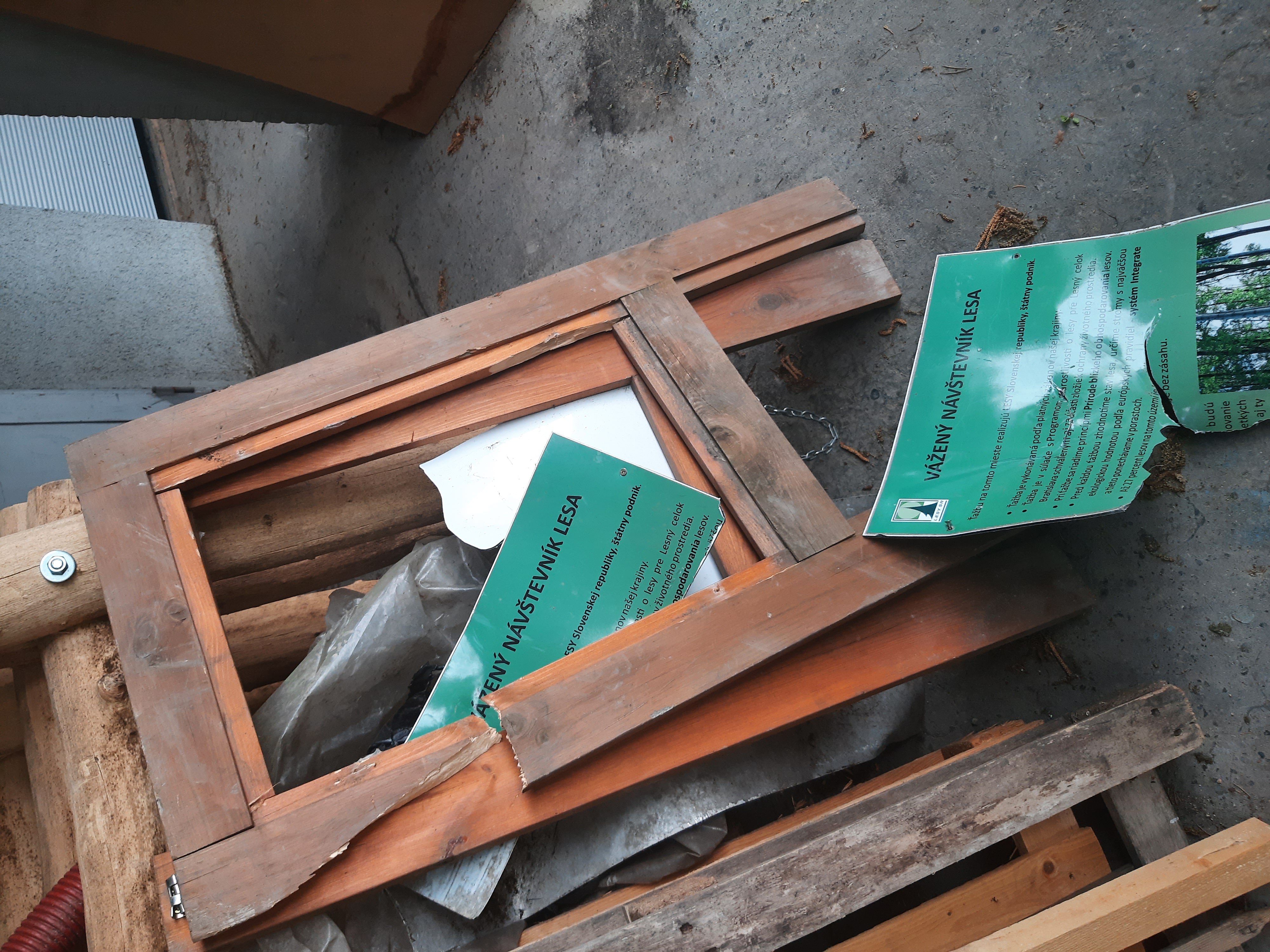 Výmena návštevníkmi lesa zničenej tabule za novú.