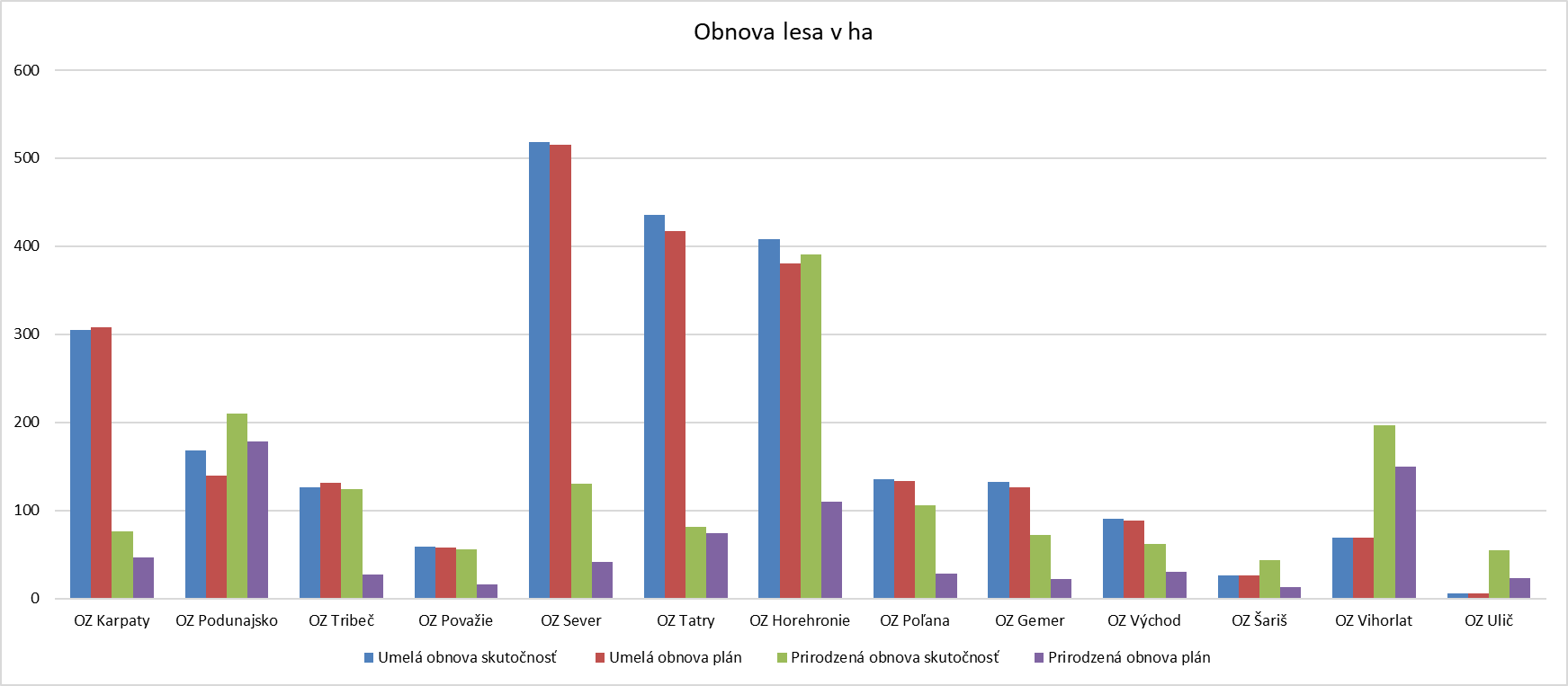 Z porovnania plánovaných a skutočne vykonaných úloh v obnove lesa vyplynulo vysoké prekročenie plánu, ktoré bolo dané zvýšeným rozsahom prirodzenej obnovy. Oproti plánovaným 760 ha sa zrealizovalo 1 604 ha, plán na výkone najvýraznejšie prekročila organizačná zložka OZ Horehronie o 281,19 ha, OZ Tribeč o 97,06 ha a OZ Sever o 89,16 ha. V umelej obnove bol plán prekročený o 79 ha, oproti plánovaným 2 401 ha sa zrealizovalo 2 480 ha. Tento výkon nesplnila organizačná zložka OZ Tribeč o 5,69 ha (do plánu bolo zahrnuté aj zalesnenie určené na prefinancovanie z fondov EÚ, ktoré sa zrealizuje až v roku 2025) a OZ Karpaty zalesnenie nesplnilo o 3,56 ha z dôvodu výdatných dažďov v mesiaci september, kde na podmáčaných plochách nebolo možné ukončiť včas celoplošnú prípravu pôdy a následne vykonať umelú obnovu.