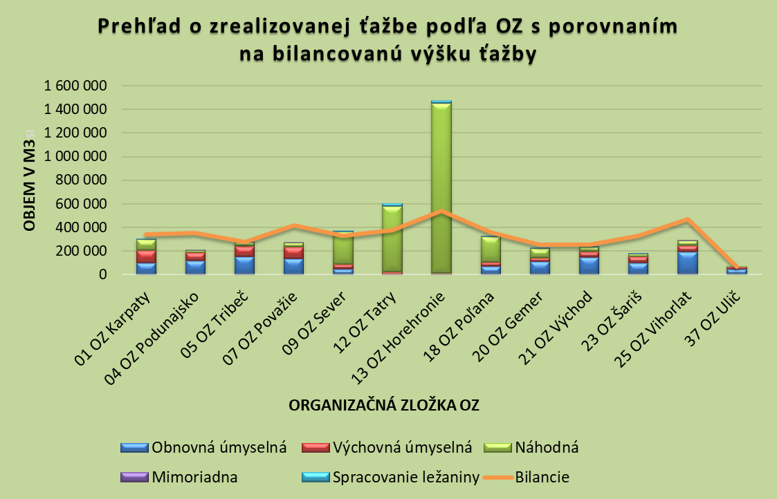 Plán ihličnatej ťažby bol prekročený o 577 703 m3 z dôvodu prekročenia náhodnej ihličnatej ťažby o 594,7 tis. m3. Plán listnatej ťažby nebol splnený (-13 633 m3) z dôvodu nesplnenia plánovaného objemu obnovnej listnatej ťažby o 64,8 tis. m3 a objemu výchovnej listnatej ťažby o 47,7 tis. m3. Schodok plánovaného objemu listnatej ťažby bol čiastočne kompenzovaný v listnatej náhodnej ťažbe, pri ktorej došlo k prekročeniu plánu o 91,4 tis. m3.Plán obnovnej úmyselnej ťažby v objeme 1 302 992 m3 bol splnený na 93,11 % (-89,7 tis. m3). Plán bol nesplnený v obnovnej ihličnatej ťažbe o 12,84 % a listnatej ťažbe o 5,85 %.