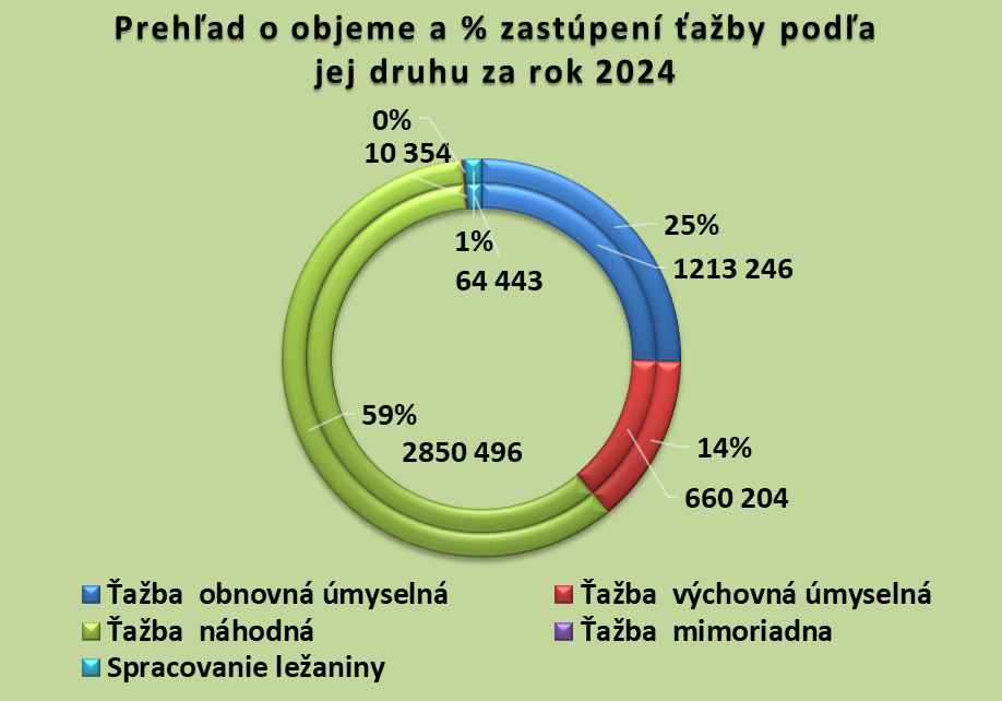 V roku 2024 bola ťažba naplánovaná v objeme 4 234 672 m3, z toho 2 467 590 m3 ihličnatého dreva a 1 767 083 m3 listnatého dreva. Plán ťažby bol splnený na 113,32 %, skutočná výška ťažby bola 4 798 742 m3 (+564 070 m3). Plán ihličnatej ťažby bol splnený na 123,41 %, so skutočnou výškou ťažby 3 045 292 m3. Plán listnatej ťažby bol splnený na 99,23 %, so skutočnou výškou ťažby 1 753 450 m3. Medziročne sa objem ťažby zvýšil o 33 % (+1 169 784 m3).