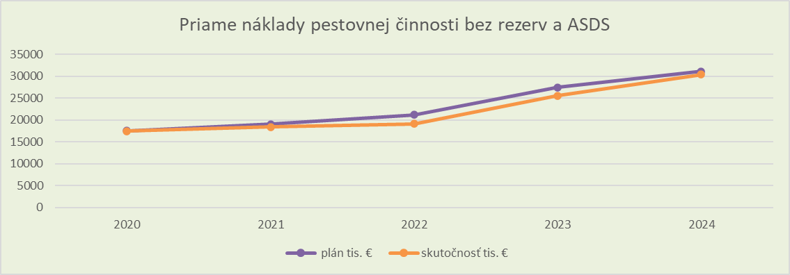 Priame náklady (PN) pestovnej činnosti (PČ) bez rezerv a nákladov na automatizovaný stacionárny detekčný systém proti požiarom (ASDS) boli plánované v celkovej sume 31 060,50 tis. €. Celkový medziročný nárast plánovaných a aj skutočných nákladov na pestovnú činnosť je zrejmý z nasledovného grafu: